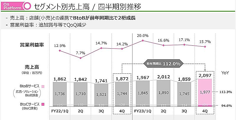 化粧品・美容の総合サイト「@cosme」を基盤とした事業を手がけるマーケティング支援事業(旧On Platform事業)のうち、BtoBサービスのみの連結売上高は前期比9.5%増の74億5700万円だった。なお、2024年6月期から「On Platform」セグメントを「マーケティング支援」セグメントに刷新。旧「On Platform」セグメントではBtoBサービスとBtoCサービスの両方を手がけていたが、「マーケティング支援」セグメントではBtoBサービスのみを対象とする。