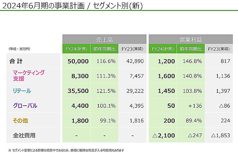 2024年6月期の「マーケティング支援」セグメントの連結業績は、売上高83億円、営業利益16億円を予想している。
