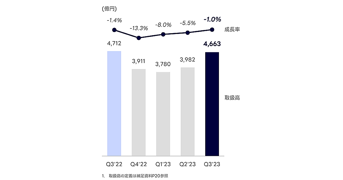その影響を受け、ショッピング事業の成長率は2022年10-12月期(2023年第3四半期)に前年同期比1.4%減でマイナス成長に転じた(取扱高は4712億円)。その後、2023年1-3月期(同第4四半期)は同13.3%減の3911億円、2023年4-6月期(第1四半期)は同8.0%減の3780億円、2023年7-9月期(第2四半期)は同5.5%減の3982億円。直近の2023年10-12月期(第3四半期)は同1.0%減の4663億円と推移してきた。