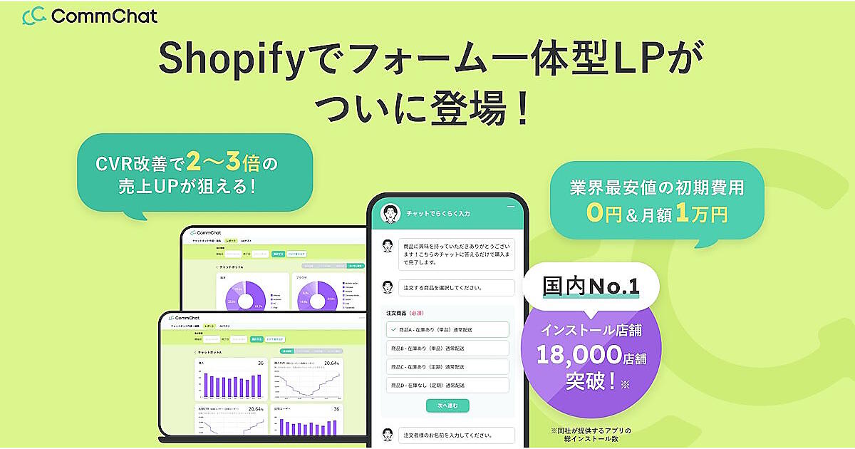 購入フローの長さがEC事業者の課題にあがっていた「Shopify」。これに起因するカゴ落ちなどの課題を解決するツールを、「Shopify」向けアプリの開発などを行うハックルベリーが開発した。フォーム一体型のランディングページ(LP)を通じてワンステップ決済を実現する「CommChat(コムチャット)」。商品の購入フローが1ページにまとめることができ、エンドユーザーはチャット形式で回答するだけで決済まで完了できる仕組みだ。「コムチャット」開発責任者の須佐和希氏に取材した。