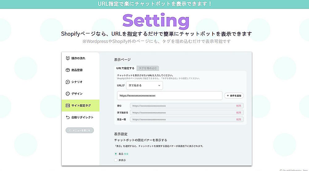 「Shopify」で構築したサイトの場合はURLの指定によってチャットボットを表示できる。それ以外の構築サイトでも、タグを埋め込むことで表示可能だ。