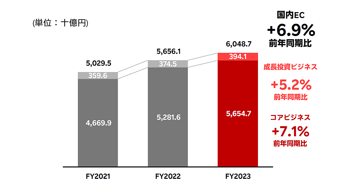 楽天グループの2023年度(2023年1~12月期)国内EC流通総額は前期比6.9%増の6兆487億円だった。
