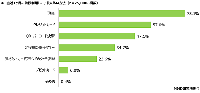 普段利用している支払い方法について、直近1か月の支払い方法の割合を聞いたところ、最多は「現金」(78.1%)で、次いで「クレジットカード」(57.0%)「QR・バーコード決済」(47.1%)だった。