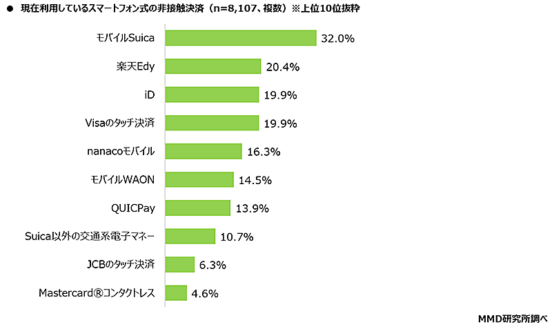 スマホの非接触決済、上位は「モバイルSuica」「楽天Edy」「iD」