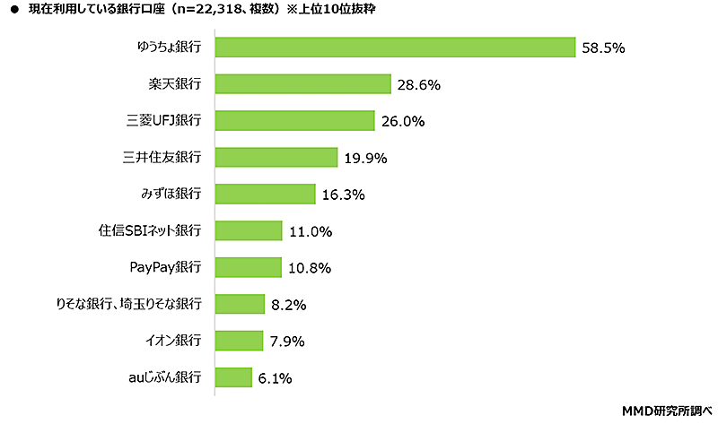 利用している銀行口座上位は「ゆうちょ」「楽天」「三菱UFJ」