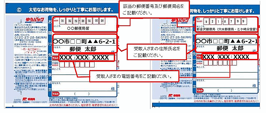 保管期間は10日間。期間経過後、連絡することなく荷物を戻すことなどを引き受け条件としている。送り状には該当する郵便局名と郵便番号の記載を求めている。