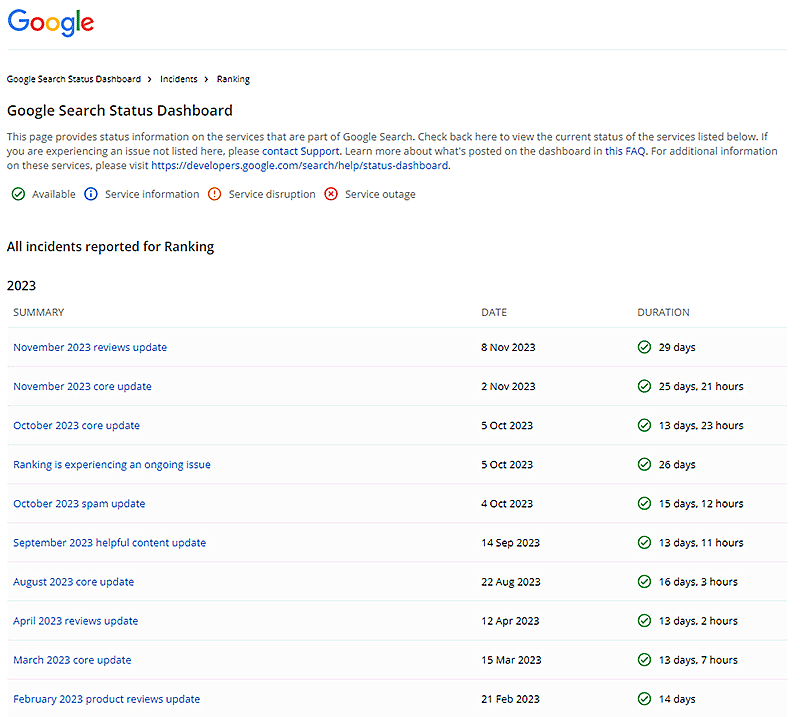 下図は「Google Search Status Dashboard」、Googleの検索に関するアップデートのダッシュボードです。4回のコアアップデートと、9月に展開された「ヘルプフルコンテンツアップデート(HCU)」に注目してみましょう。