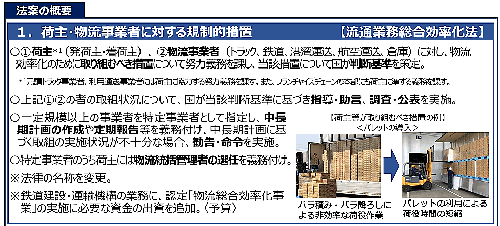 「流通業務総合効率化法」の改正案では、荷主と物流事業者に対し、物流効率化のために取り組むべき措置について努力義務を課し、国が判断基準を策定。取り組み状況については、国が判断基準に基づいて指導・助言、調査・公表を実施する内容を盛り込んだ。