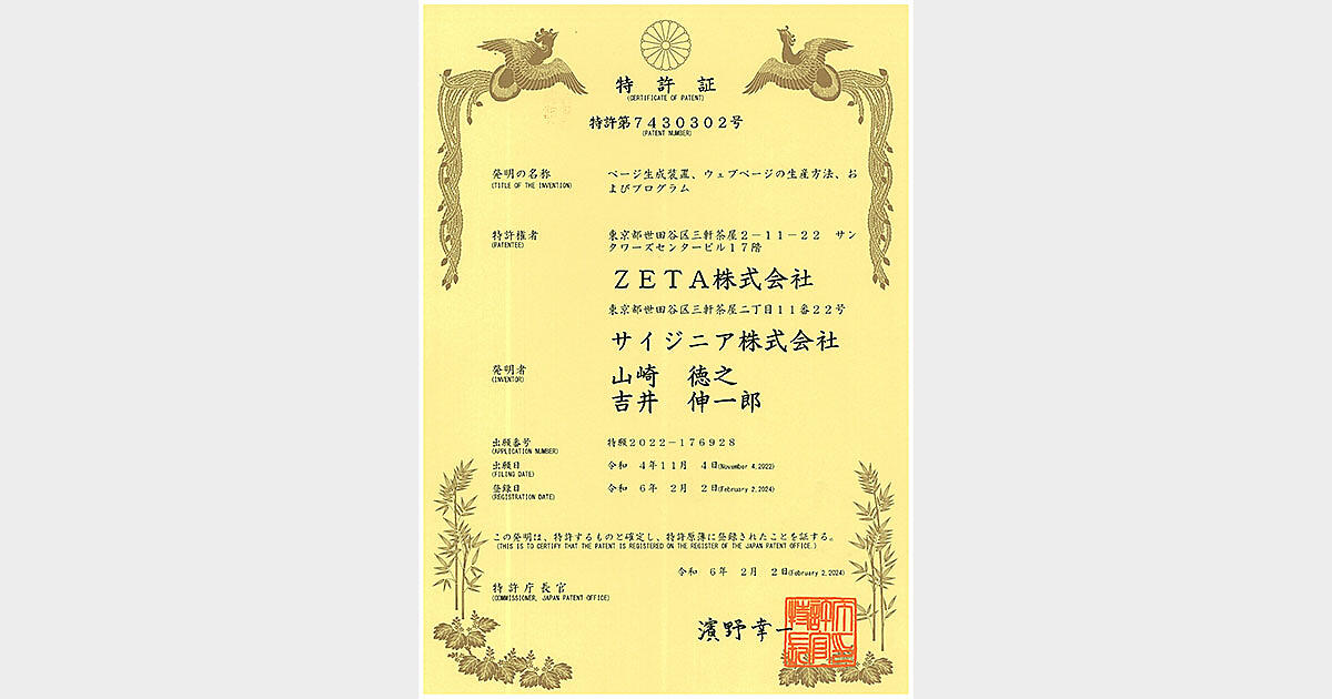 ZETAは、ハッシュタグ活用エンジン「ZETA HASHTAG」の提供技術における新たな特許を取得したと発表した。