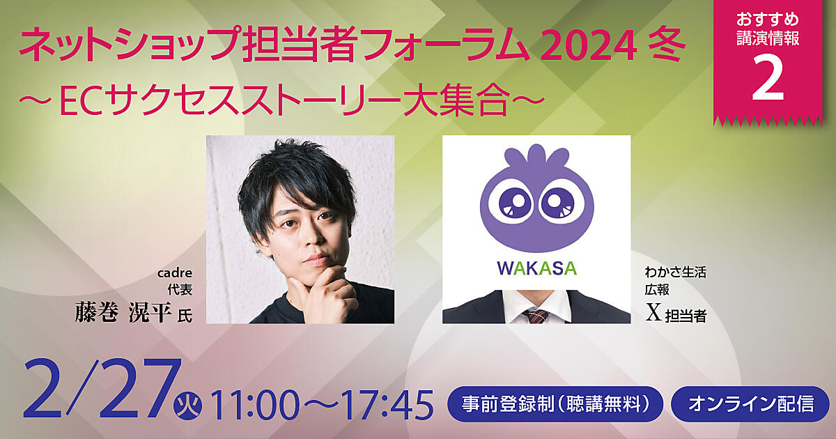 2月27日(火)に開催する「ネットショップ担当者フォーラム 2024 冬」は、オンワード、わかさ生活、土屋鞄製造所(登壇は親会社のHARIZURY)、エドウイン、cadreといった企業が登壇。オンラインで開催します!