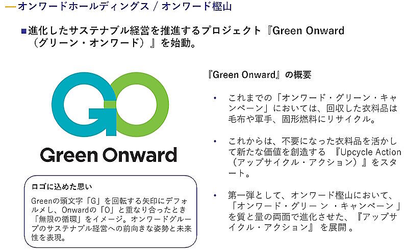 「オンワード・グリーン・キャンペーン」は、オンワードグループの環境経営推進の一環として、顧客が使った自社の衣料品を利用者から引き取り、可能な限りリユース・リサイクルする取り組み。衣料品循環システムの構築をめざす。