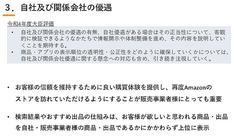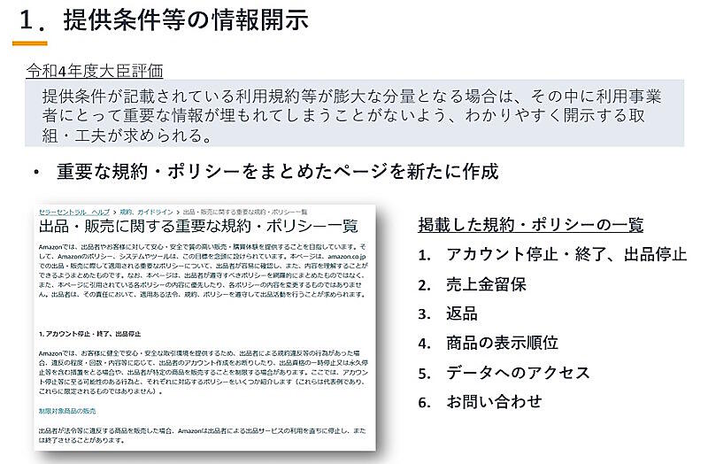 経産省は、アマゾンジャパンの直近の取り組みとして「出品・販売に関して重要と思われる規約やヘルプページをまとめたページを新たに作成・公開したことは評価できる」(経産省の取りまとめより)とした一方、2022年度の大臣評価で示された内容のさらなる対応を求める方針を示した。
