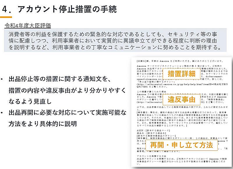 アカウント停止などの措置を行うに当たって、消費者などの利益保護とのバランスを図りつつ、適正なプロセスを確保するとともに、継続的に対応改善を図っていくことが求められる。具体的には、アマゾンジャパンによるアカウント停止措置や措置が誤っていた場合の対応に関する説明、楽天グループによる通知文の見直しを含め、オンラインモール各社には、2022年度の大臣評価で示された取組を更に進めることが求められる。(経産省の取りまとめより)
