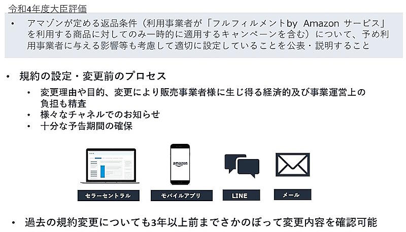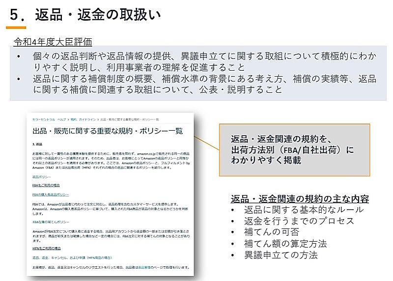 「楽天市場」「Yahoo!ショッピング」は、返品・返金条件の設定、個別の返品・返金の受け入れは出店者の判断事項のため、返品に関する出店者の不満が生じにくい。「Amazon.co.jp」は、Amazon出品サービスなどはアマゾンジャパンが返品・返金に関する条件の設定、個々の返品・返金に関する対応を行う場合がある。そのため、出品事業者からの不満が生じやすい状況にあるとし、2022年度の大臣評価でアマゾンジャパンに対して次の対応を個別に「期待する」とした。