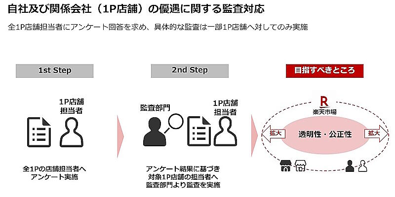 - 楽天グループ:自社および関係会社の優遇に関する監査対応として、ファーストパーティー店舗に対して説明会を実施。アンケートを行い、各ファーストパーティー店舗の担当者に対して、監査部門からヒアリングを実施している。