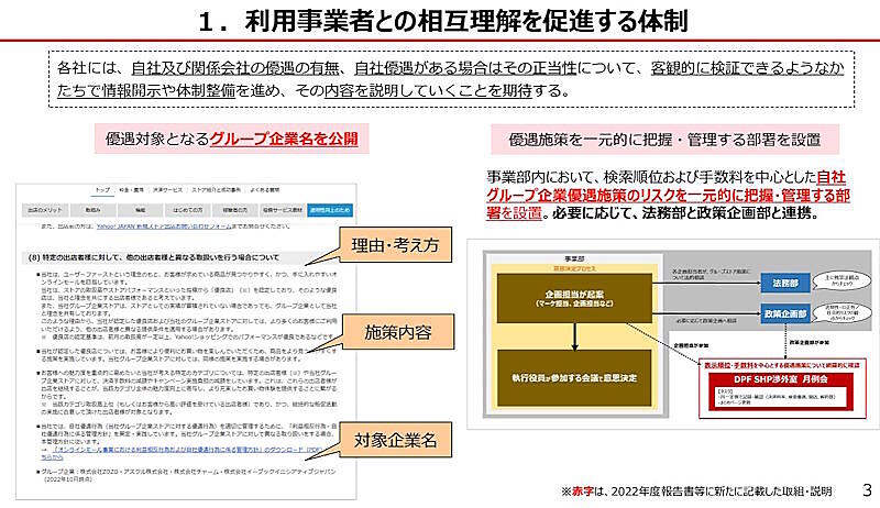 特定デジタルプラットフォーム提供者には、自社及び関係会社の優遇に対する懸念に応える情報開示、自社優遇措置の管理体制の整備を進め、これらの取組内容を客観的に検証できる形で説明していくことが求められる。