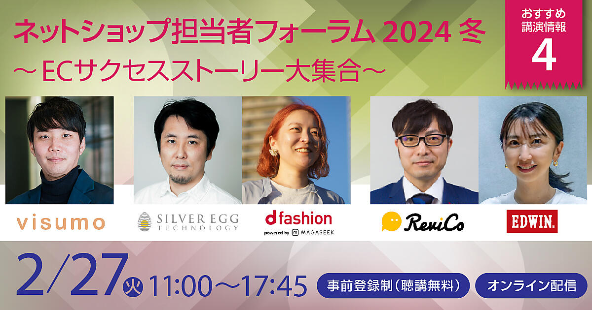 2月27日(火)に開催する「ネットショップ担当者フォーラム 2024 冬」は、エドウイン、土屋鞄製造所(登壇は親会社のHARIZURY)、カリモク家具、オンワード、シャープ、わかさ生活、エドウインといった企業が登壇。オンラインで開催します!