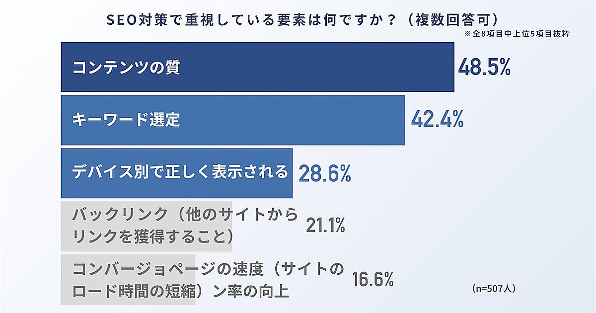 SEO対策で重視している要素を聞いたところ、最も多かった回答は「コンテンツの質」(48.5%)。「キーワード選定」(42.4%)、「デバイス別で正しく表示される」(28.6%)が続いた。