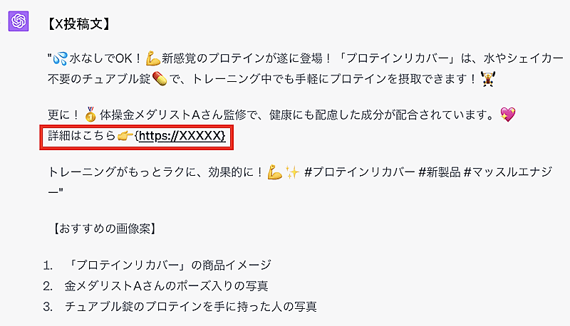 さて、プロンプトを入力した結果、ChatGPTはどんな回答を返してくるでしょうか。プロンプトの{SNS}の部分を「X」とした例です。お知らせや商品ページに誘導しています。