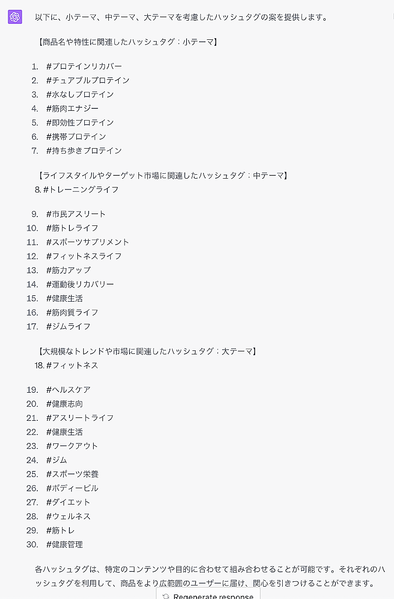 GPT-4の出力例です。小テーマ、中テーマ、大テーマを把握して、ハッシュタグが提案されました。バランス良く選ぶことができますね。