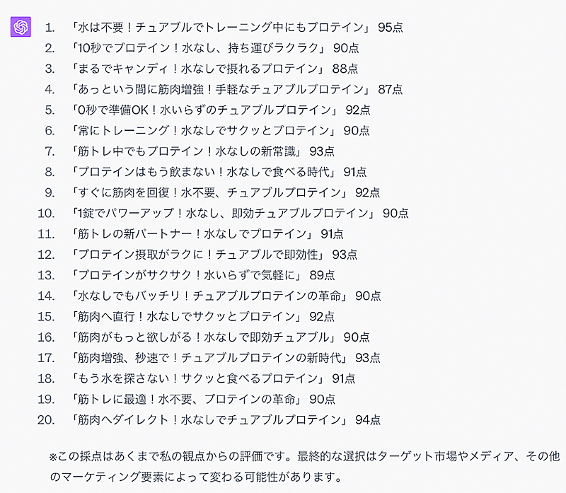 点数自体は、何を基準にしているのかが明確でなく、あまり参考にならないかもしれませんが、20案を全て見るのも疲れるので、何から検討すべきかアタリをつける参考になります。「“話題性”“顧客がクリックするか”“商品メリットが訴求できているか”の観点から評価して」などと評価軸をつけてもよいでしょう。