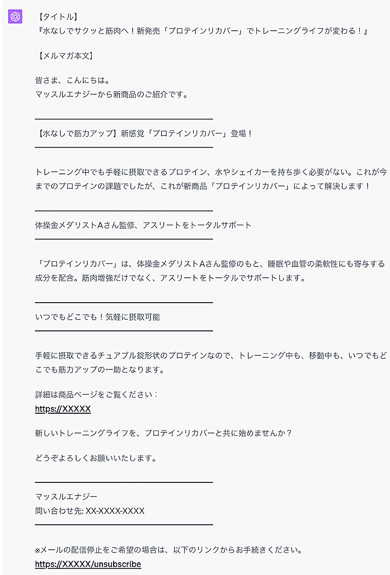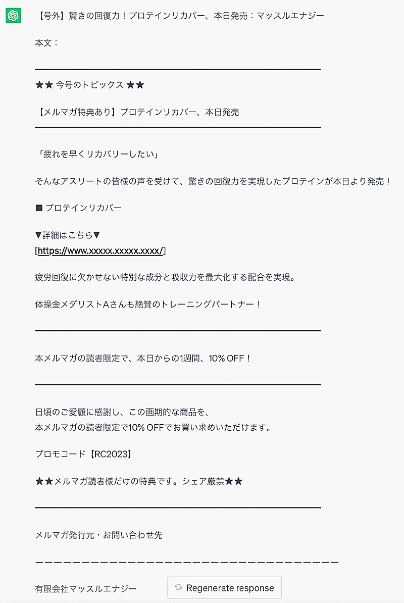 今度は既存顧客にも、新商品を周知しましょう。メルマガは各社、文体もバラエティに富んでいると思いますが、ここでは、テキストメールでのメルマガを想定してプロンプトを入力してみます。
