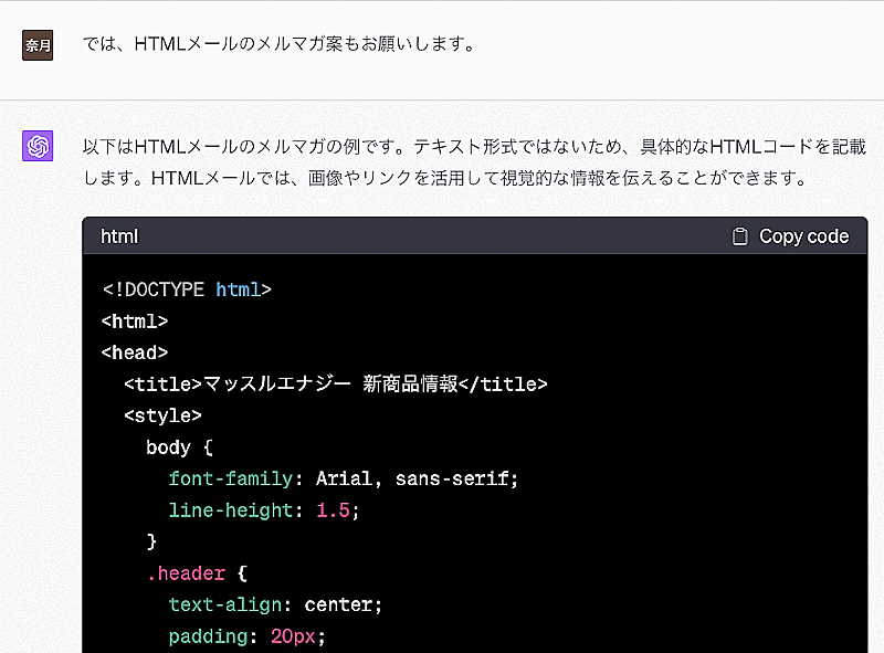 また、ChatGPTの強みの1つはコードが書けること。HTMLメール案をHTMLで出力することも可能です。コーディングもできる!というネットショップ担当者の方は、コードを書くサポートツールとしてもご活用いただきたいと思います。