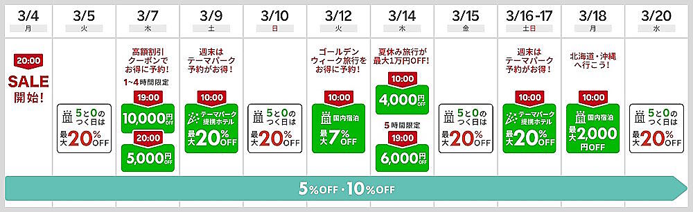 また、時期や目的に合わせて使える多種多様なクーポンを用意している。たとえば、3月5日(火)からは日替わりクーポンが順次利用できるようになる。このほか、3月7日(木)に1時間限定で利用できる国内宿泊施設1万円割引クーポン、3月14日(木)限定利用の夏休み期間向けクーポン、3月9日(土)、3月16日(土)、3月17日(日)限定利用のテーマパークがあるエリアへの旅行に利用できるクーポンなど。