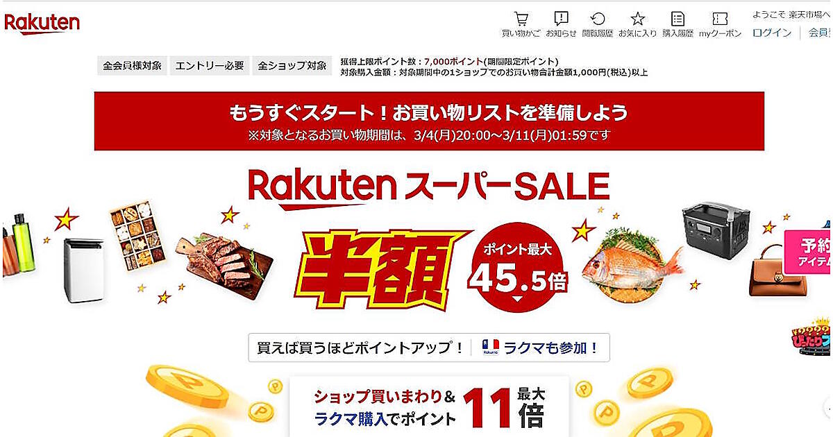 楽天グループは3月4日20時から、「楽天市場」内で「楽天スーパーセール」を開催する。初めて「楽天市場」で買い物したユーザーには1500ポイントを付与(1注文あたりの最低購入金額は税込3000円以上)するほか、買い回りを促す施策など、さまざまなキャンペーンを展開する。セール期間は3月11日の1時59分まで。