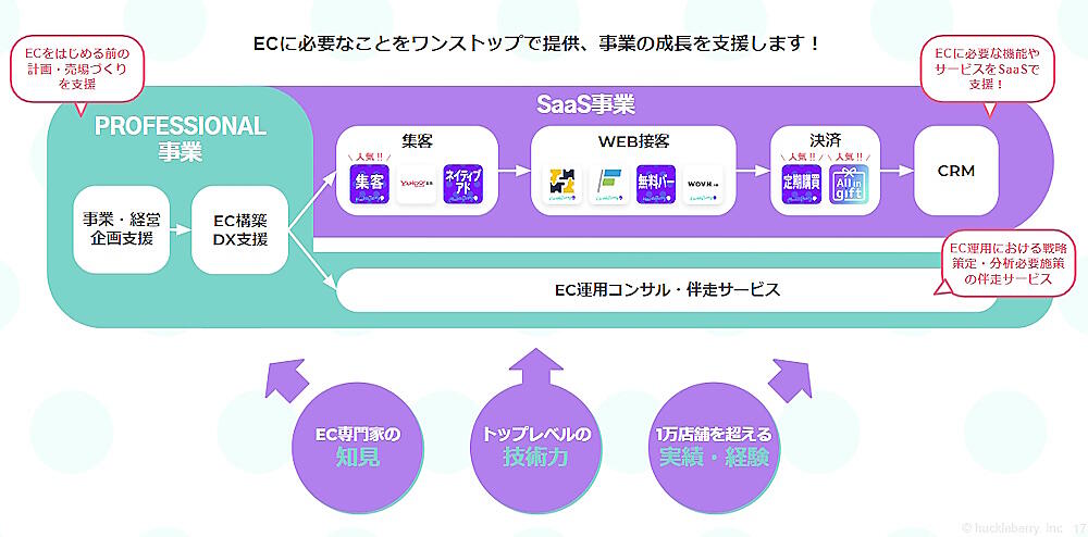 ハックルベリーは、D2C、サブスクリプションといったさまざまなモデルのEC事業を対象に企画・設計、ECサイト構築、運用まで幅広くサポートしている。これまでに約100件以上のECサイトの構築を支援。提供サービスの累計インストール数は2万となっている。