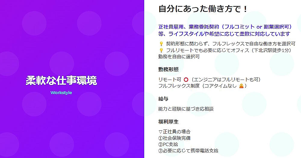 特筆すべき点としては、副業からでもハックルベリーのメンバーに参画できること。このほか、正社員には産育休の制度も設けている。メンバーのワークライフバランスや働きやすさなどを考慮しており、実際に産休を取得している社員もいる。