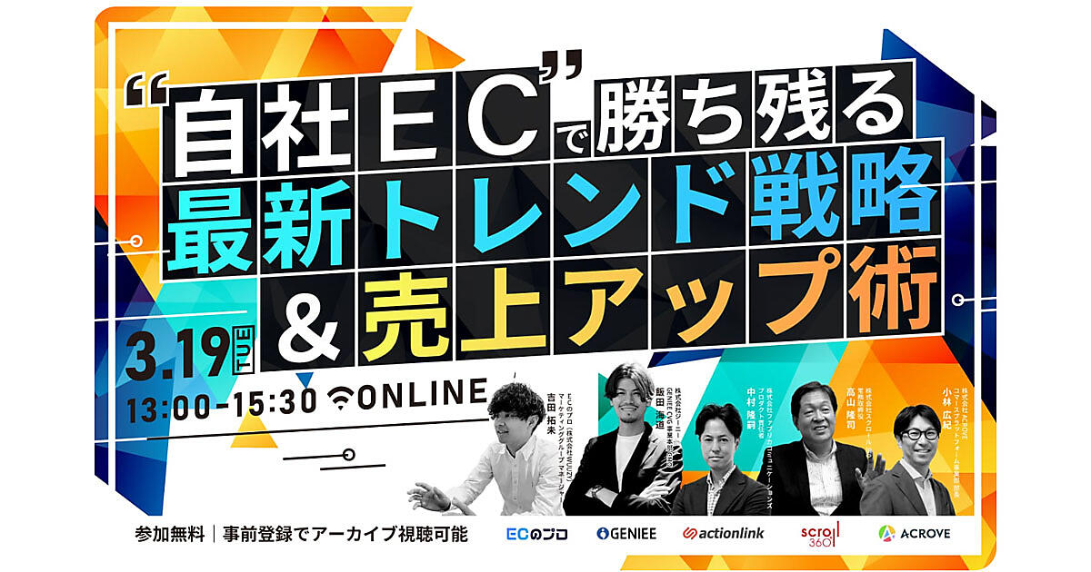WUUZYは3月19日(火)、スクロール360、ジーニー、ファブリカコミュニケーションズ、ACROVEと合同オンラインセミナー「“自社EC”で勝ち残る!最新トレンド戦略&売上アップ術」を開催する。