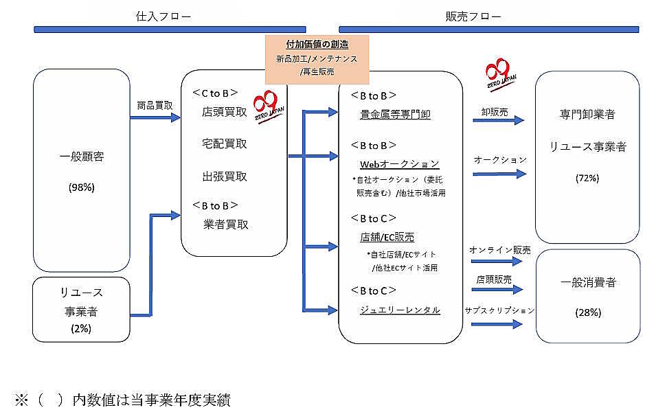 このほか、「自社オークションにおける委託販売」「レンタルジュエリーのサブスクリプション」も展開。「自社オークションにおける委託販売」は、自社で運営するオークションで、自社仕入商品以外にオークションに参加するリユース事業者の商品を委託出品することで、出品事業者から手数料を徴収している。委託商品が落札された場合、落札事業者からも手数料を得る。「レンタルジュエリーのサブスクリプション」は、一部ジュエリー商品をメンテナンス、再生加工後、レンタルジュエリーとして展開している。