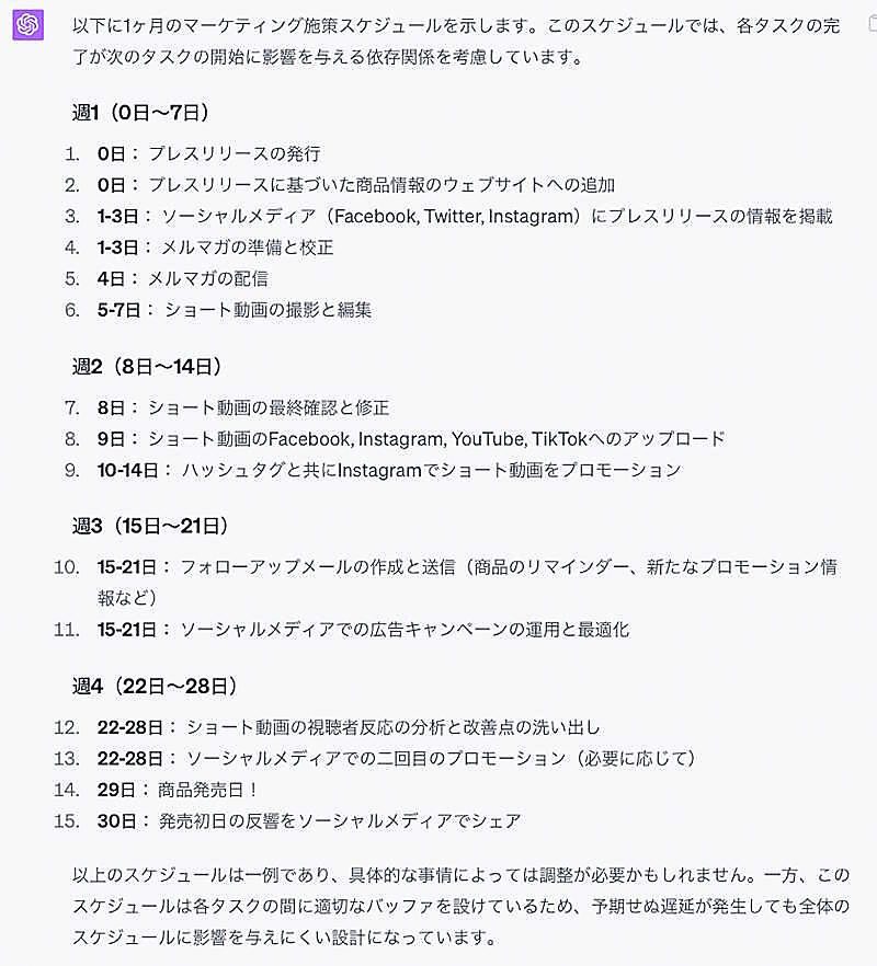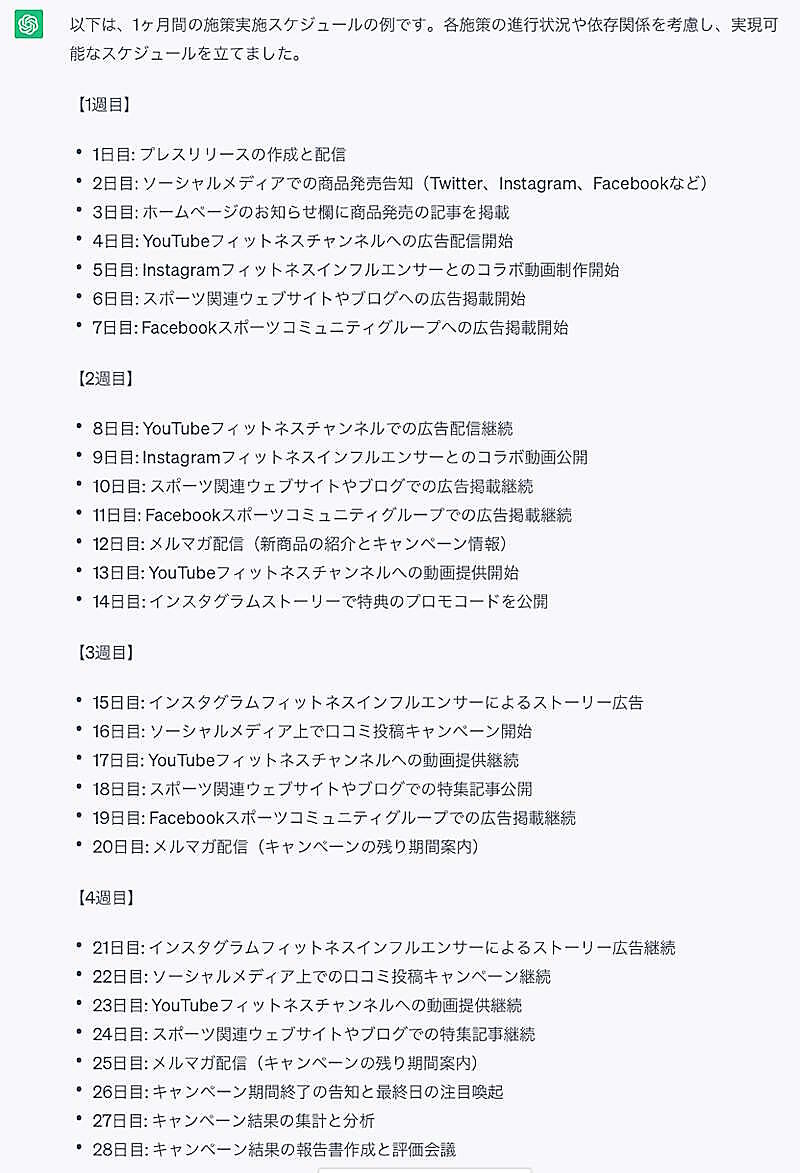 やる施策、やらない施策を決めた上で再度スケジュールを立ててもらう、もしくは、会話を続けて精度を高めても良いでしょう。例えば、「フィードバックします。施策を実施するのは兼務1名で制約があります。また会社には週に2日の休日があります。これを考慮して、実現可能なスケジュールを立ててください」など情報を追加してみましょう。