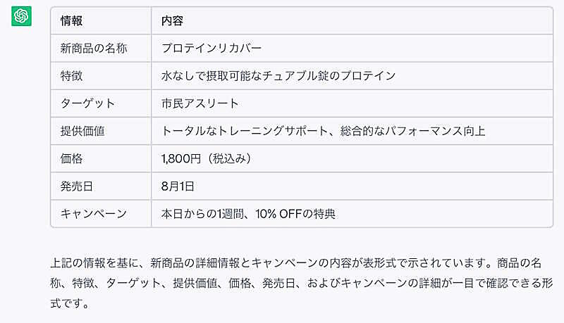 あなたは広報担当者です。以下の「企画書」をもとに、「情報」を抽出し、表形式で出力してください。