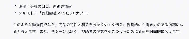 以下はGPT-3.5の出力例です。この情報をベースに、各種プロモーションの文章作成やアイデア出しを進めることができます。では、今回はまず初めにショート動画の構成案を提案してもらいましょう。