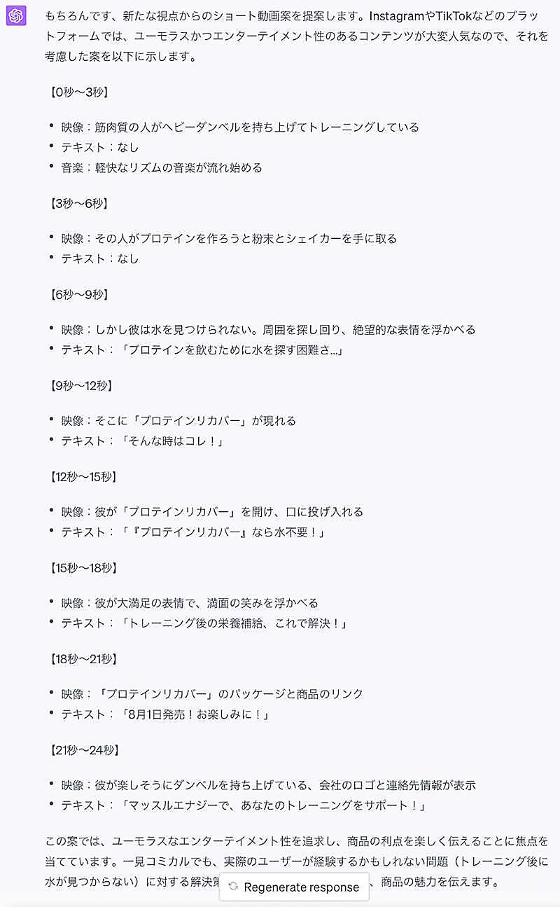 ちなみに、上記の内容をプロンプトに入れると、GPT-4では以下のような出力結果となりました。登場人物の「筋肉質の人」のキャラクターに左右されそうですが、エンターテイメント性が強化され、ユーモラスな動画の案が提示されています。ここまで具体的であれば、演者の筋肉質の人にもイメージが伝わりやすいでしょう。