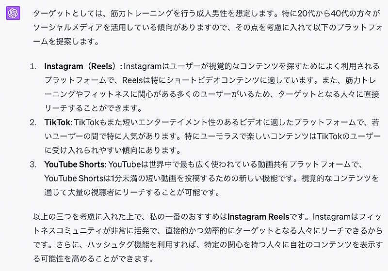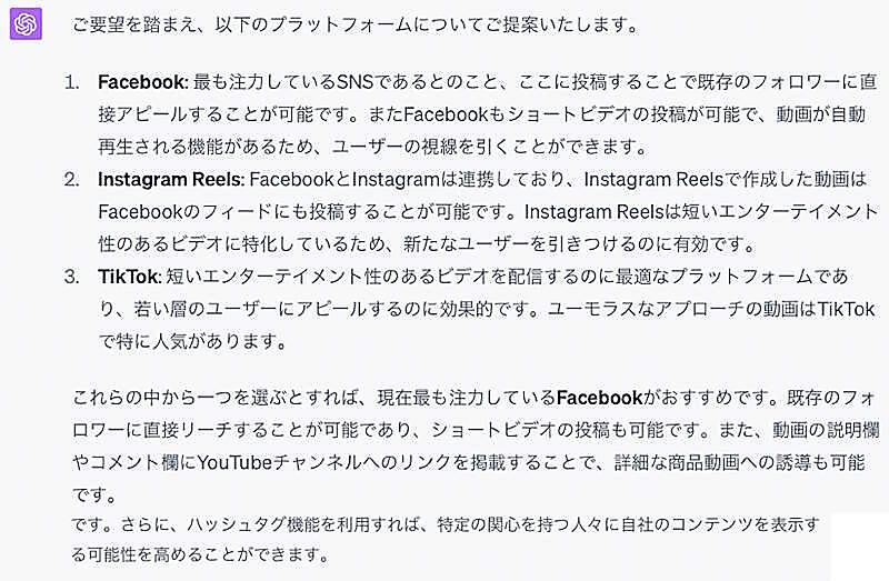 また、SNSにおけるショート動画は、ショート動画単体でその商材の売り上げが立つわけではないため、購買までの導線も検討する必要があります。「最も注力しているSNSはFacebookです。YouTubeチャンネルに詳細な商品動画をアップするので、本編の動画にも誘導したいです」など、関連する施策をプロンプトに含めると考慮された回答を出してきます。
