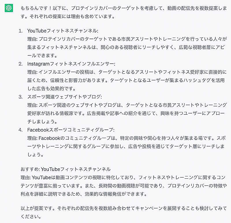 以下は、最初に提案があった宣伝色の強い動画の配信先として、GPT-3.5が出力した例です。
