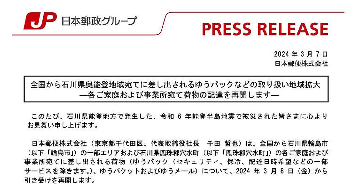 日本郵便は3月8日から、石川県輪島市の一部エリア、鳳珠郡穴水町の家庭と事業所宛て荷物(一部サービス除く)の全国からの引き受けを再開する。