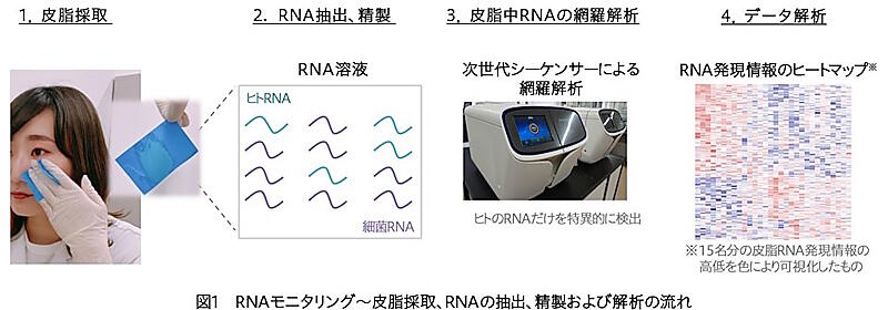 RNAは、体調や食生活、運動、ストレス、紫外線といった環境要因によって日々変化し、その時々の肌や体の状態を知るのに有用な体内情報。「皮脂RNAモニタリング」は、あぶらとりフィルムで顔の皮脂を採取し、その皮脂からRNAを抽出して網羅的に分析する解析技術。