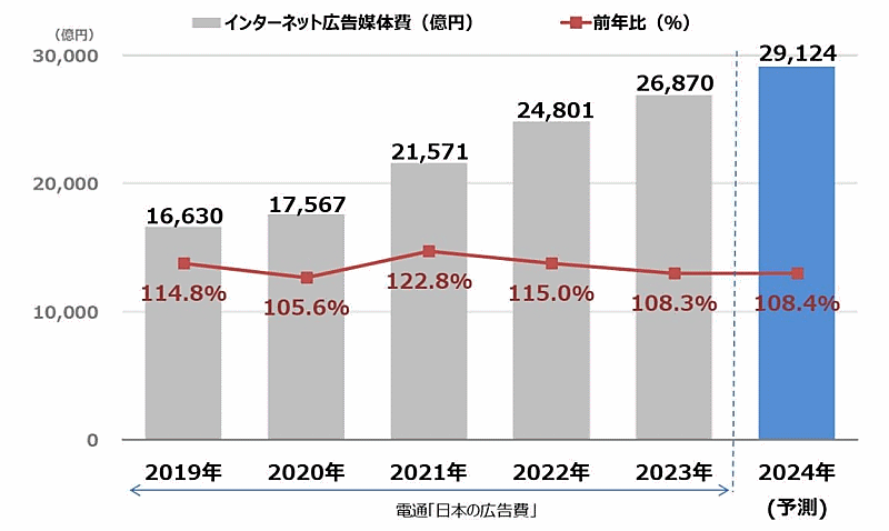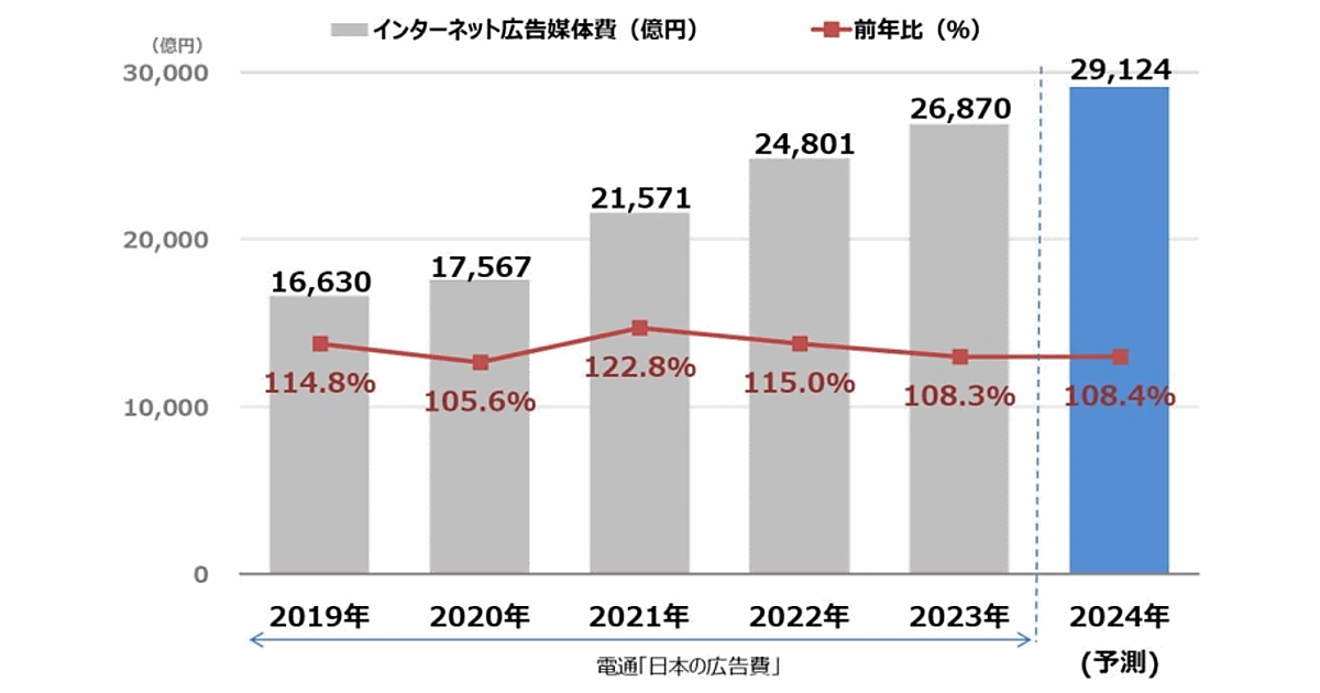 2023年のインターネット広告費は、前年比7.8%増の3兆3330億円で過去最高を更新。金額ベースでは同2418億円増加で、日本の総広告費全体の45.5%を占めている。