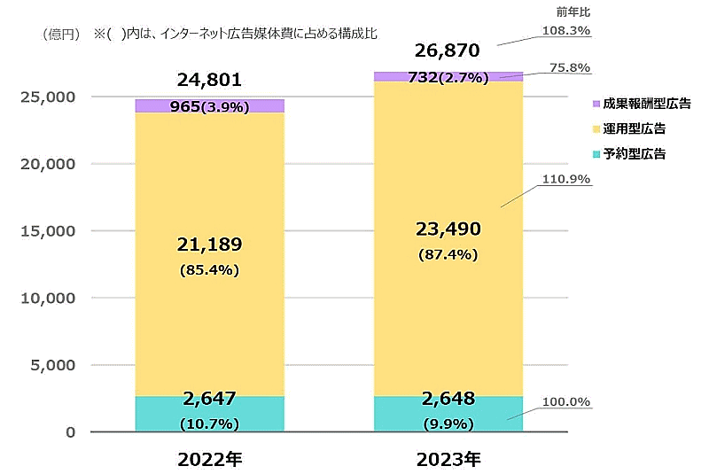 運用型広告は同10.9%増の2兆3490億円で、インターネット広告媒体費に占める構成比は87.4%。予約型広告は同0.0%(2022年は2647億円、2023年は2648億円)と横ばい、成果報酬型広告は同24.2%減の732億円だった。