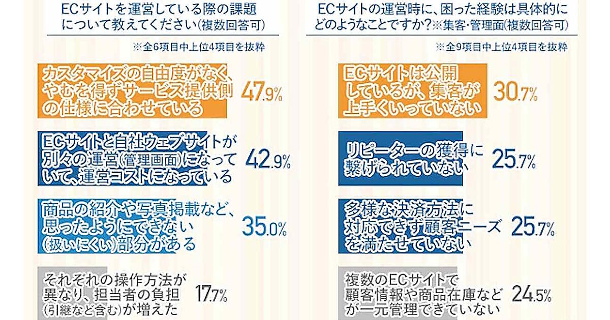 ECサイト運営時の課題を聞いたところ、「カスタマイズの自由度がなく、やむを得ずサービス提供側の仕様に合わせている」(47.9%)が最も多かった。「ECサイトと自社Webサイトが別々の運営になっていて、運営コストになっている」(42.9%)という課題が見られた。