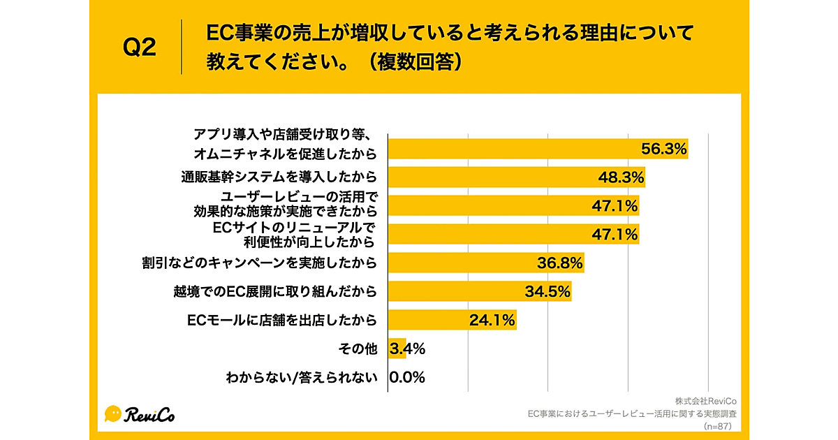 レビューマーケティングプラットフォーム「ReviCo」の開発・販売を手がけるReviCo(レビコ)が実施した「EC事業におけるユーザーレビュー活用に関する実態調査」(対象はECの経営者・事業責任者107人)によると、EC事業が増収している理由として「アプリ導入や店舗受け取り等、オムニチャネルを促進したから」(56.3%)、「通販基幹システムを導入したから」(48.3%)、「ユーザーレビューの活用で効果的な施策が実施できたから」「ECサイトのリニューアルで利便性が向上したから」(47.1%)があがった。