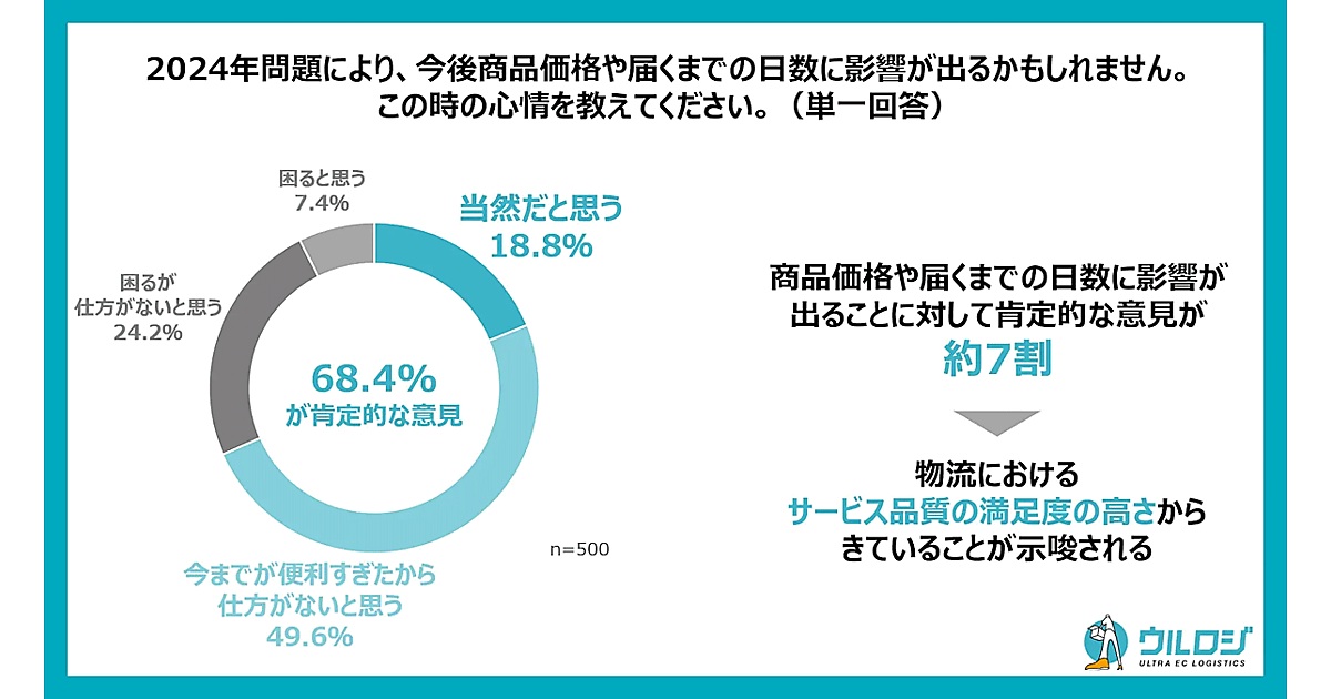 ダイレクトメールの発送代行サービスなどを展開しているディーエムソリューションズが実施した「物流2024年問題に関する消費者意識調査」によると、「物流2024年問題」による暮らしへの影響について、「当然だと思う」が18.8%、「今までが便利すぎたから仕方がないと思う」が49.6%で、全体の68.4%が商品価格や届くまでの日数に影響することについて肯定的な意見だった。