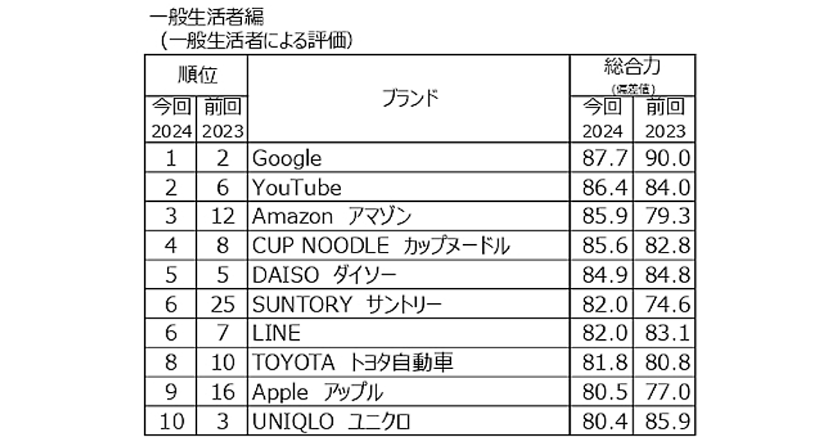 日経BPコンサルティングが発表したブランド価値評価プロジェクト「ブランド・ジャパン2024」の調査結果によると、一般生活者編の総合ランキングトップはGoogleで、6年ぶり3度目の首位となった。
