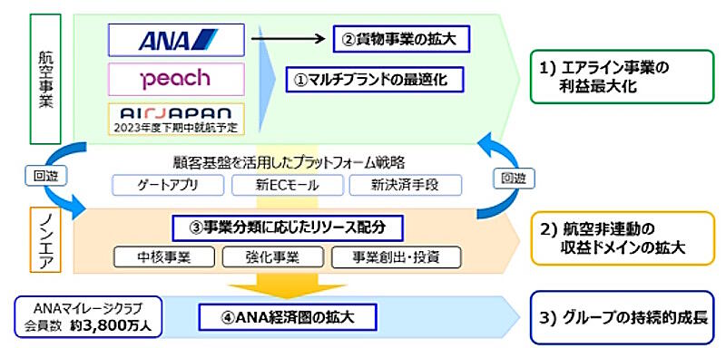 引用画像を見てわかるように、航空事業とノンエアの連結にECなどを使っていこうという構想です。移動手段として航空機を使っている人はマイルを貯めていることが多いです。そのマイルが貯めやすくなって使いやすくなれば、ANA経済圏にどっぷりという人も増えてきそうです。