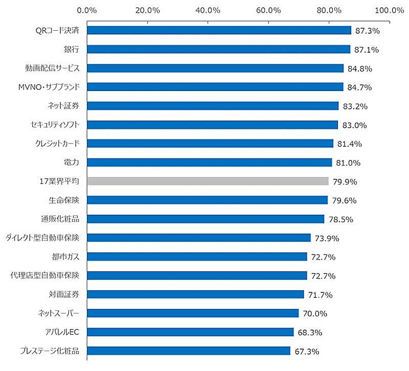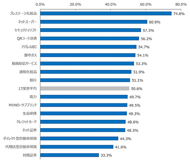 レポートの対象となった業界は、①通販化粧品②アパレルEC③ネットスーパー④動画配信サービス⑤プレステージ化粧品⑥銀行⑦生命保険⑧代理店型自動車保険⑨ダイレクト型自動車保険⑩対面証券⑪ネット証券⑫クレジットカード⑬QRコード決済⑭電力⑮都市ガス⑯MVNO・サブブランド⑰セキュリティソフト――の17業界。
