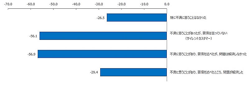 企業やサービスに対する不満とクレーム行動別に顧客ロイヤルティ(NPS)を分析したところ、「不満に思うことがあったが、苦情は言っていない」「不満に思うことがあり、苦情を述べたが、問題は解決しなかった」といったユーザーは、「特に不満に思うことはなかった」人と比較してロイヤルティが低い傾向だった。